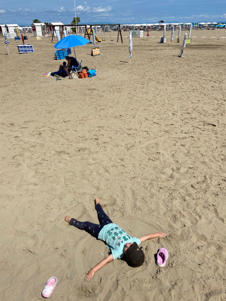 Und so machten wir uns auf den Weg zu unserem nächsten Ziel. Als Zwischenstopp wählten wir einen Strand an der Adria. Alles schien so unwirklich und unnatürlich. Angebaut für die vielen Touristen, die ihren wohlverdienten Urlaub gern im Sand, am Meer mit guter Infrastruktur verbringen wollen. Die Kinder haben es allerdings geliebt…ein Spielplatz, ein riesiger Strand und das Meer.