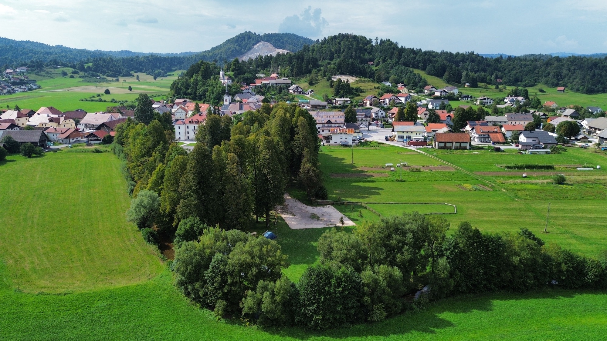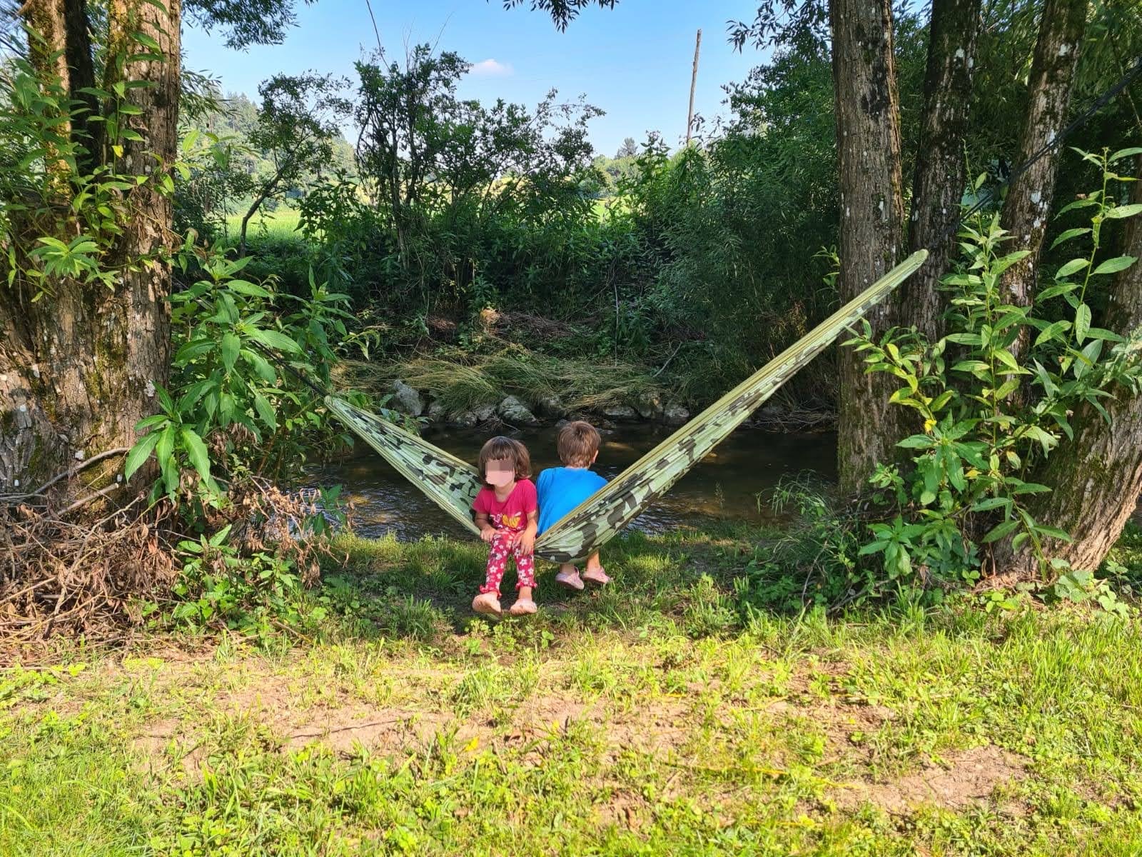 Die Fahrt war gut und wir kamen gegen frühen Abend an. Der Campingplatz GrajskiPark Vitez in Logatec war sehr idyllisch gelegen. Ein klarer Bach umrandete die Zeltwiese, die teilweise schattige Plätze bot sowie einen Unterstand mit Sitzmöglichkeiten. Wir suchten uns einen Platz mit Blick zum Wasser und den Feldern und bauten die volle Montur auf.